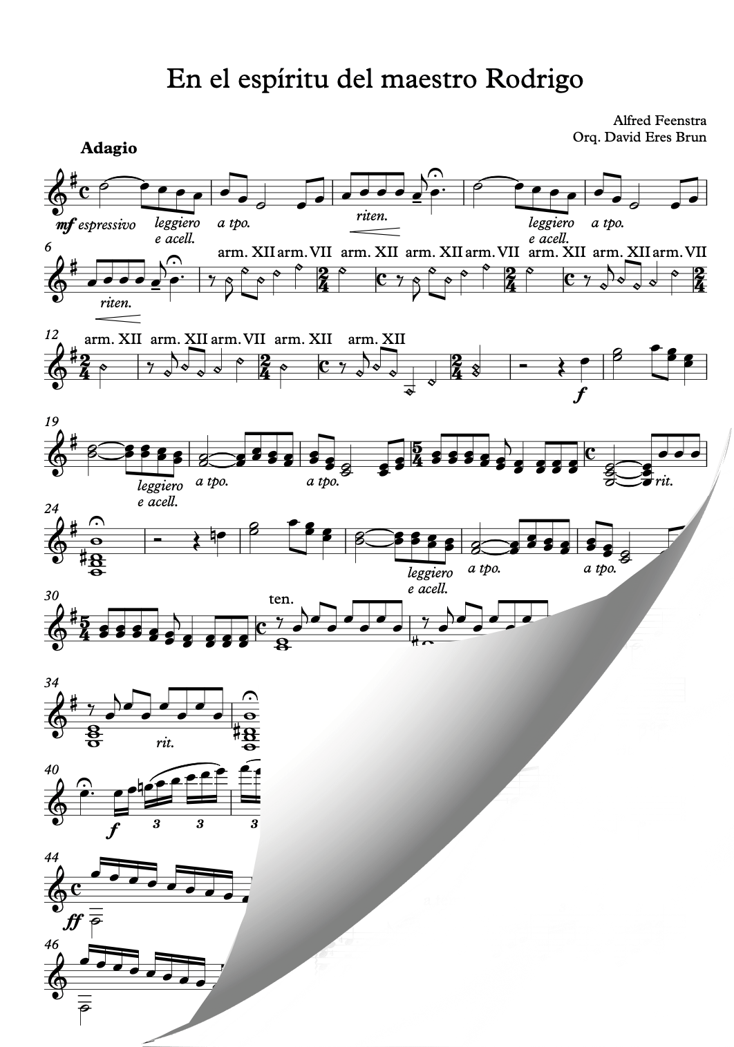 After creating the «guitar festival Maestro Joaquin Rodrigo, Quartell», I studied closer and intenseness the music that created the master. I was amazed and overwhelmed by the beauty of quite many of his works. Next to the absolutely beautiful songs he made, and of course the works for guitar and orchestra as the Concierto de Aranjuez and Fantasia of a Gentilhombre, I was deeply impressed by the Cantico of Francisco de Assis. That work was so much for me that I only could bare listen to it once in some weeks. My piece here I wrote inspired by the great master and I just hope that I can touch just a bit of the feeling that he created with his cantico.