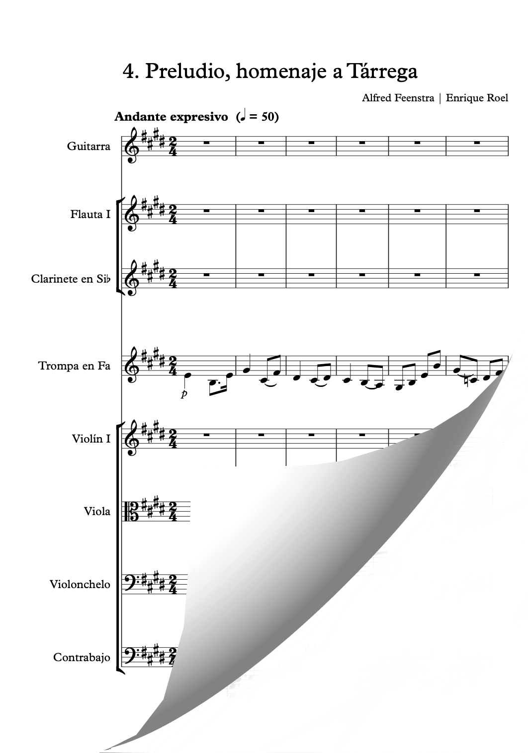 Complete Score of Preludio, homenaje a Tárrega from Nacido en Valencia in its Orchestral Suite Version for Guitar and Orchestra (Score and parts).