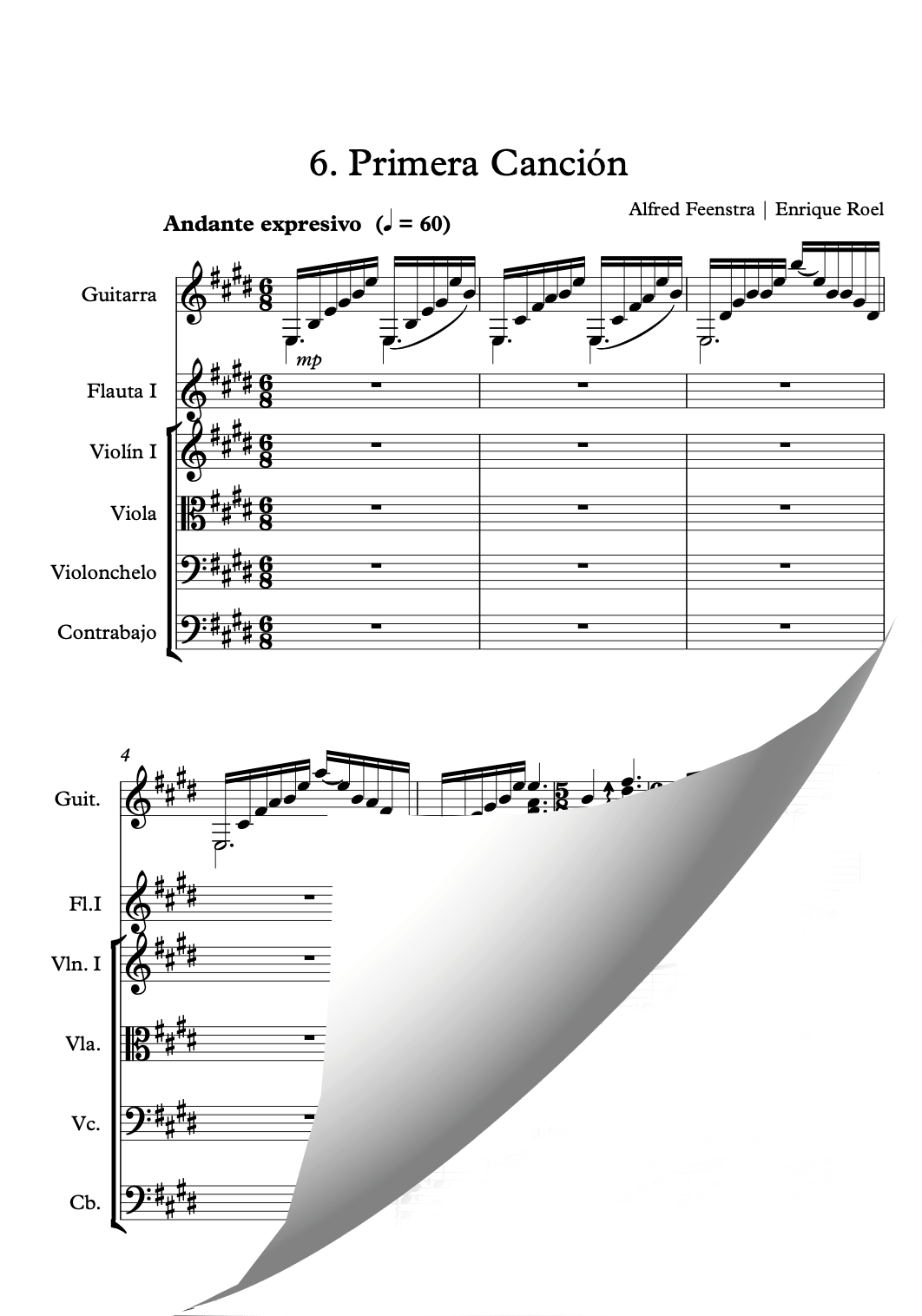 Complete Score of Primera canción from Nacido en Valencia in its Orchestral Suite Version for Guitar and Orchestra (Score and parts).